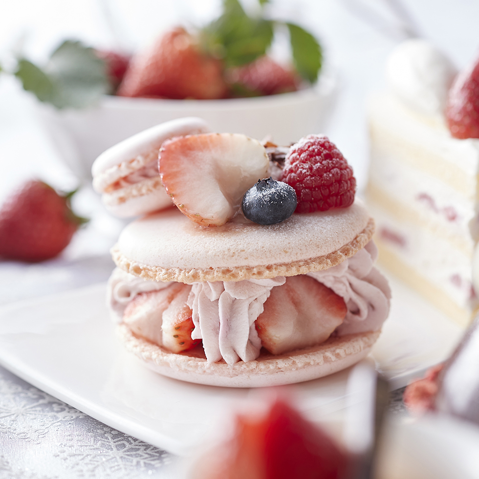 苺とクリーム、サクサク食感のマカロンのハーモニーが楽しいスイーツです。