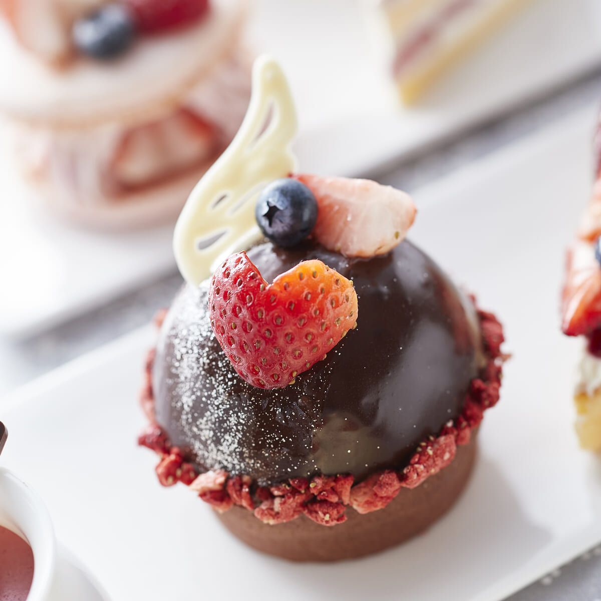 プラリネガナッシュの生チョコタルトにショコラフランボワーズムースをのせた「苺とチョコのムース」
