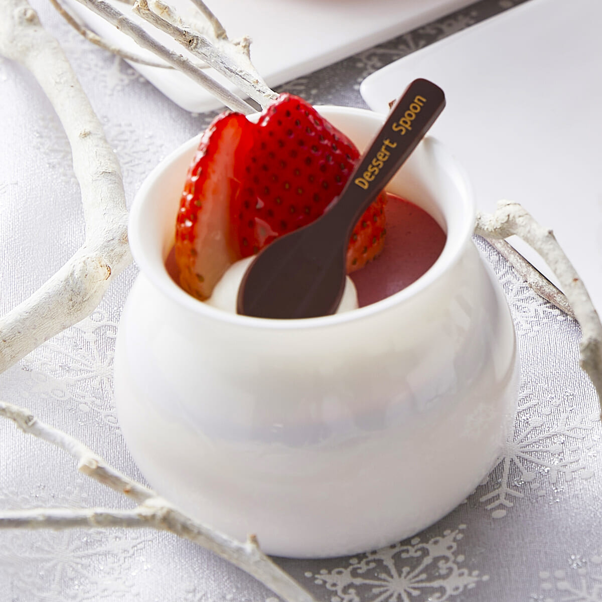 真っ白なカップが苺の鮮やかさを引き立てます。
