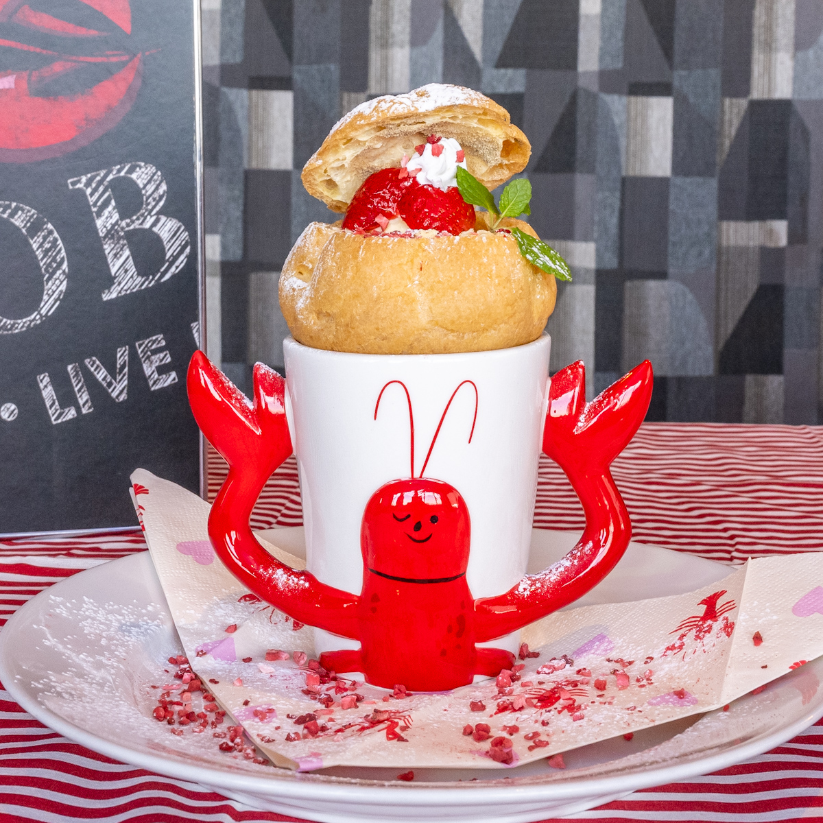北欧の伝統的なデザート「セムラ」を、ホットモカ入りのロブスター型マグカップに乗せたデザートメニュー。