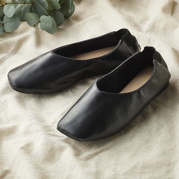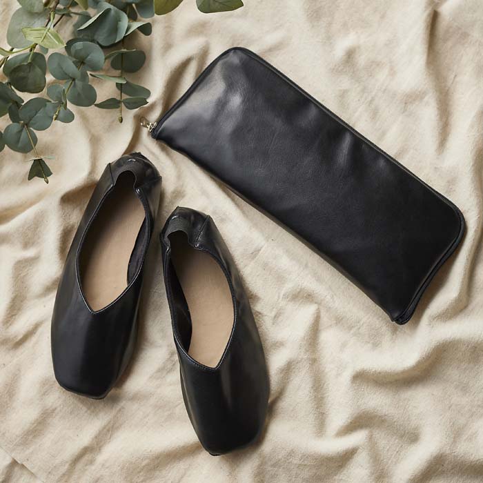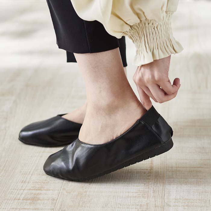 収納袋から出してそのまま履けて、混雑する出入り口でも安心して脱ぎ履きできます。