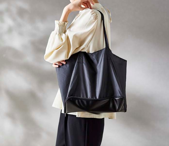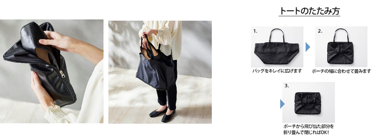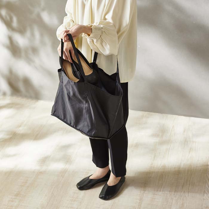 収納袋を広げると、外履きを入れて持ち運べるトートバッグに早変わり!