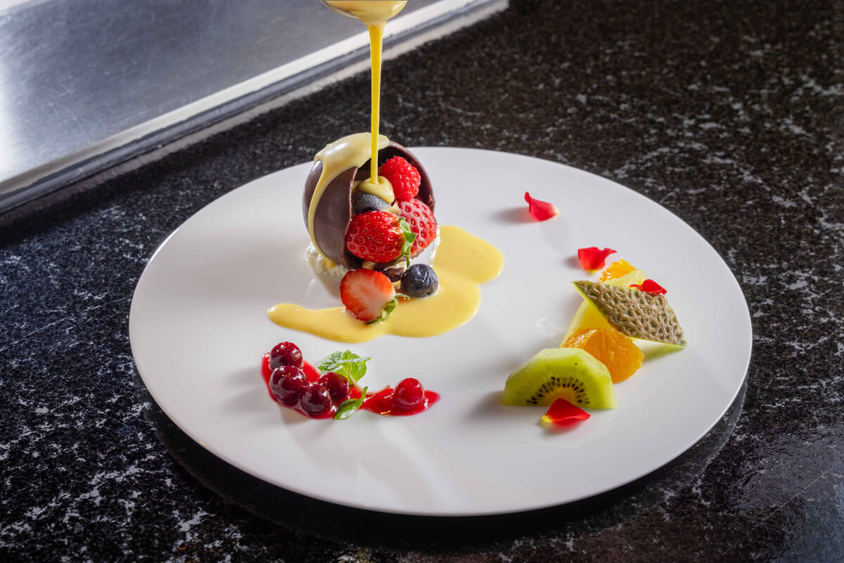 鉄板焼「那古亭」のデザートは、期間限定で「ショコラボム」を提供。