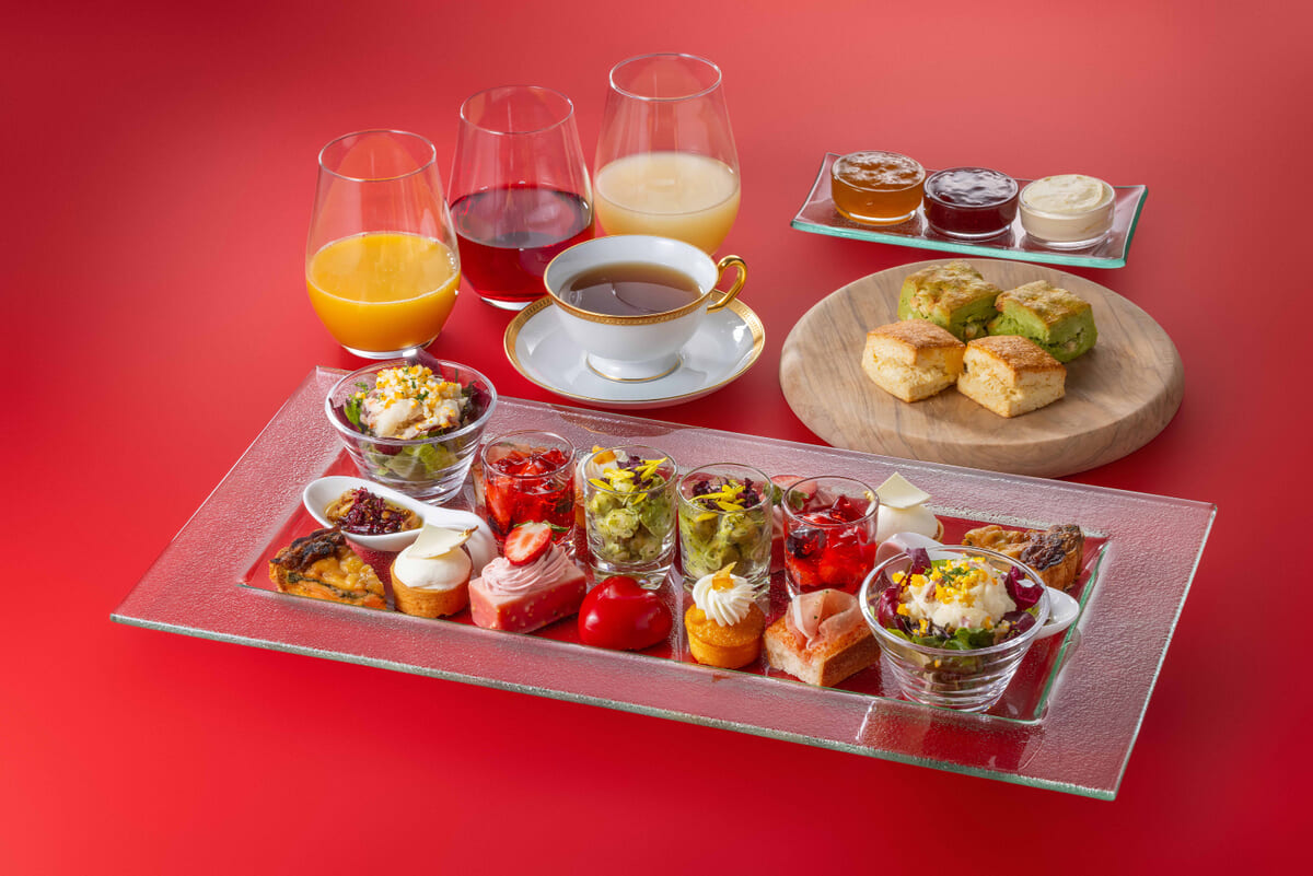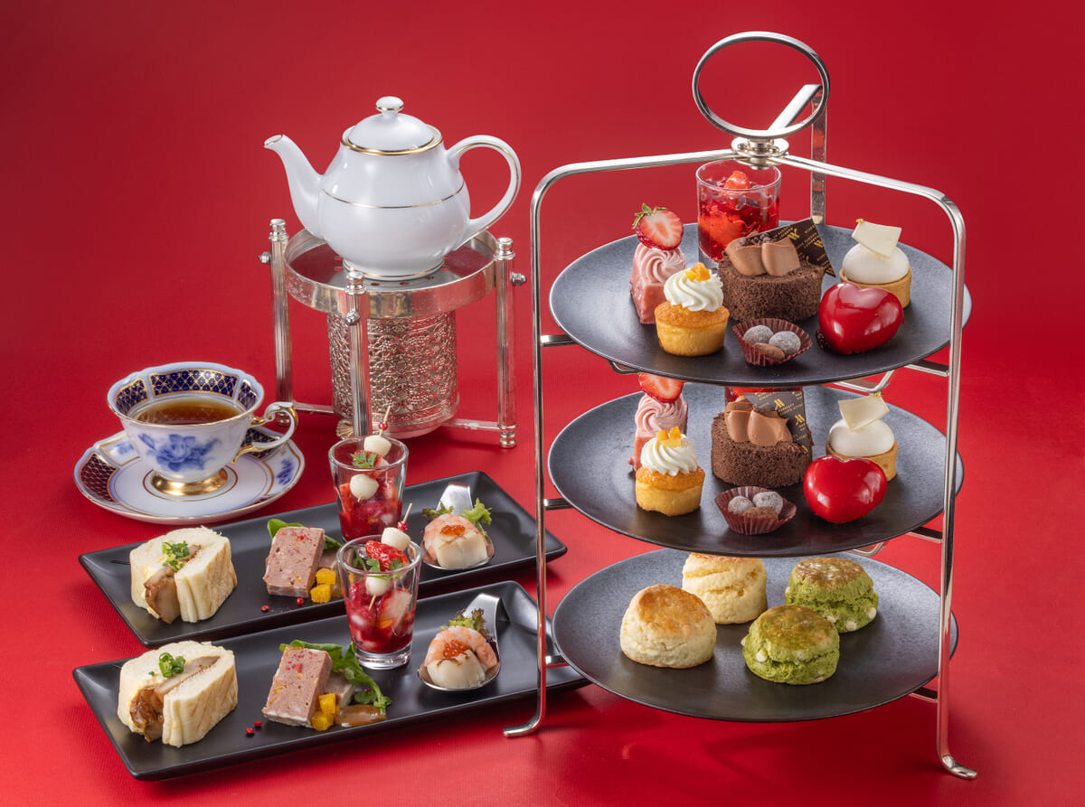 アフタヌーンティーセットには、真っ赤なグラッサージュに包まれたルビーチョコやロールケーキなど、ショコラスイーツを華やかに織り交ぜたメニューが登場。