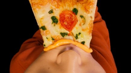 「チーズのマグマにピザをダイブ」して、ピザにかぶりつくシーンは食欲をそそります!