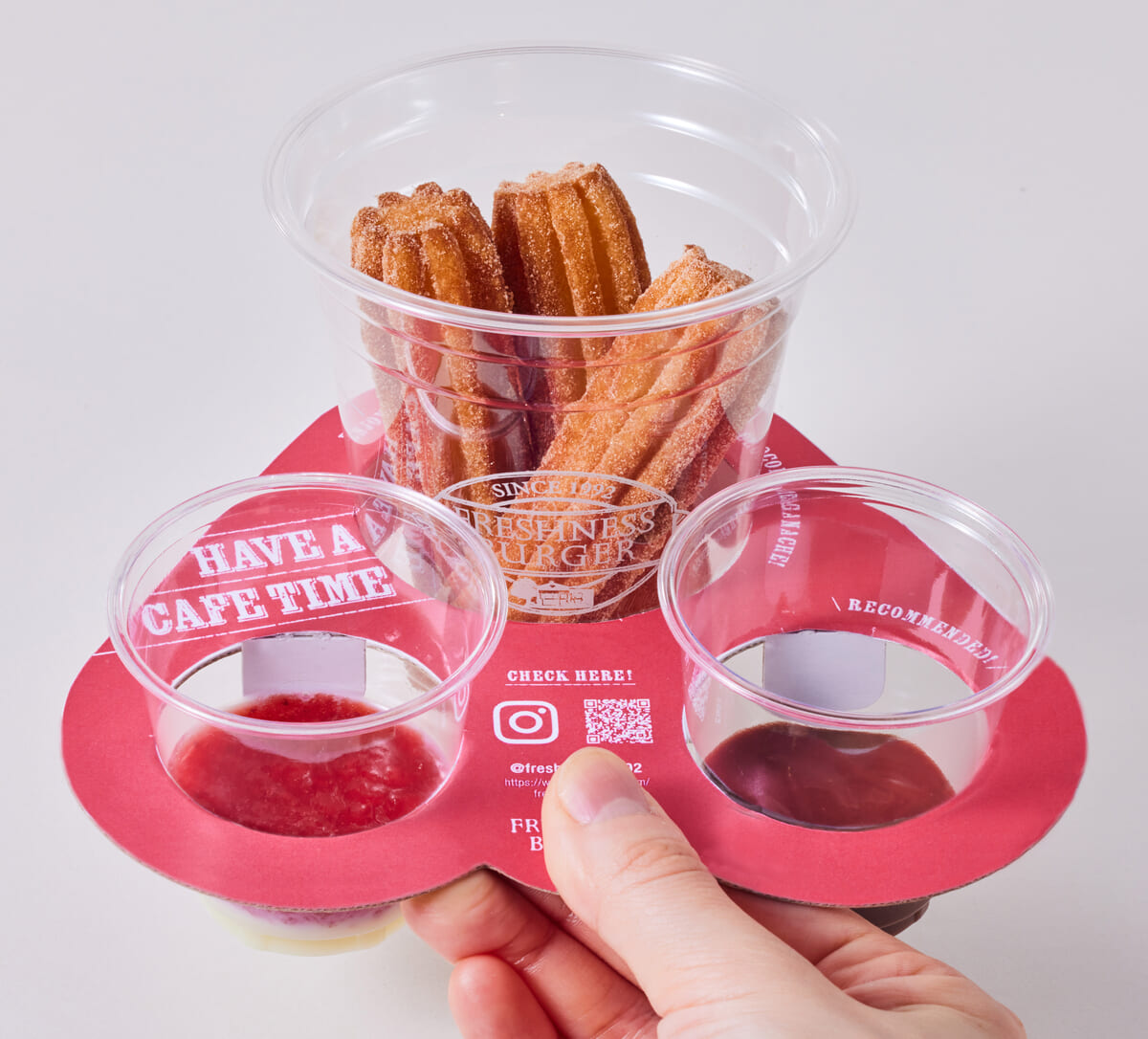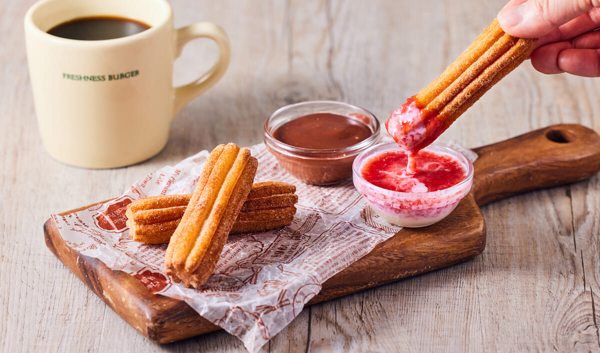 2種のソースが一度に楽しめる!フレッシュネスバーガー「揚げたてチュロス 生チョコ&いちご練乳」