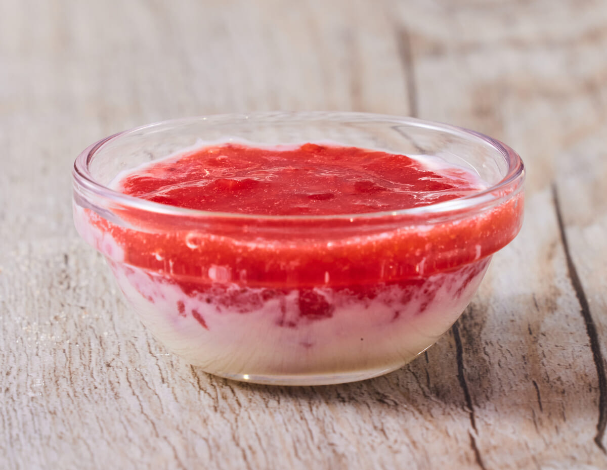 練乳の上に甘酸っぱいいちごソースをのせた、程よい甘さの中にフルーティーな酸味が広がるソースです。