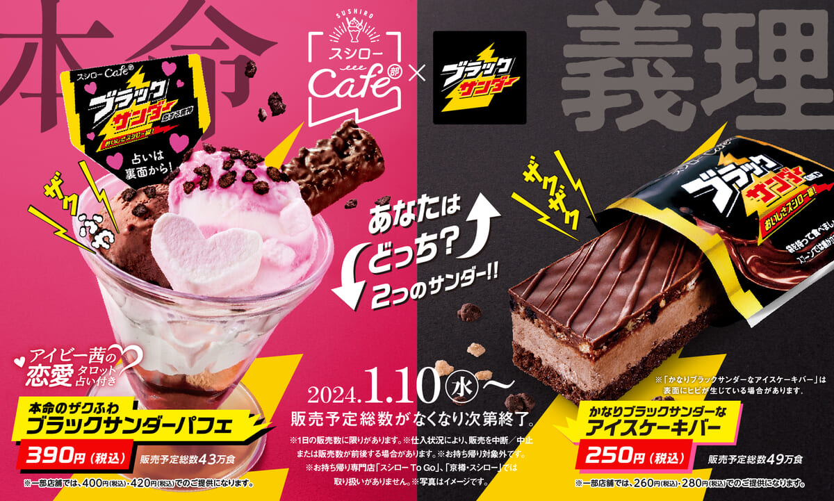 今回、1994年の発売以来、長きにわたって愛されているロングセラーチョコレート菓子「ブラックサンダー」とコラボレーションし、バレンタインに向けて“本命”と“義理”をイメージした2つのスイーツが販売されます。