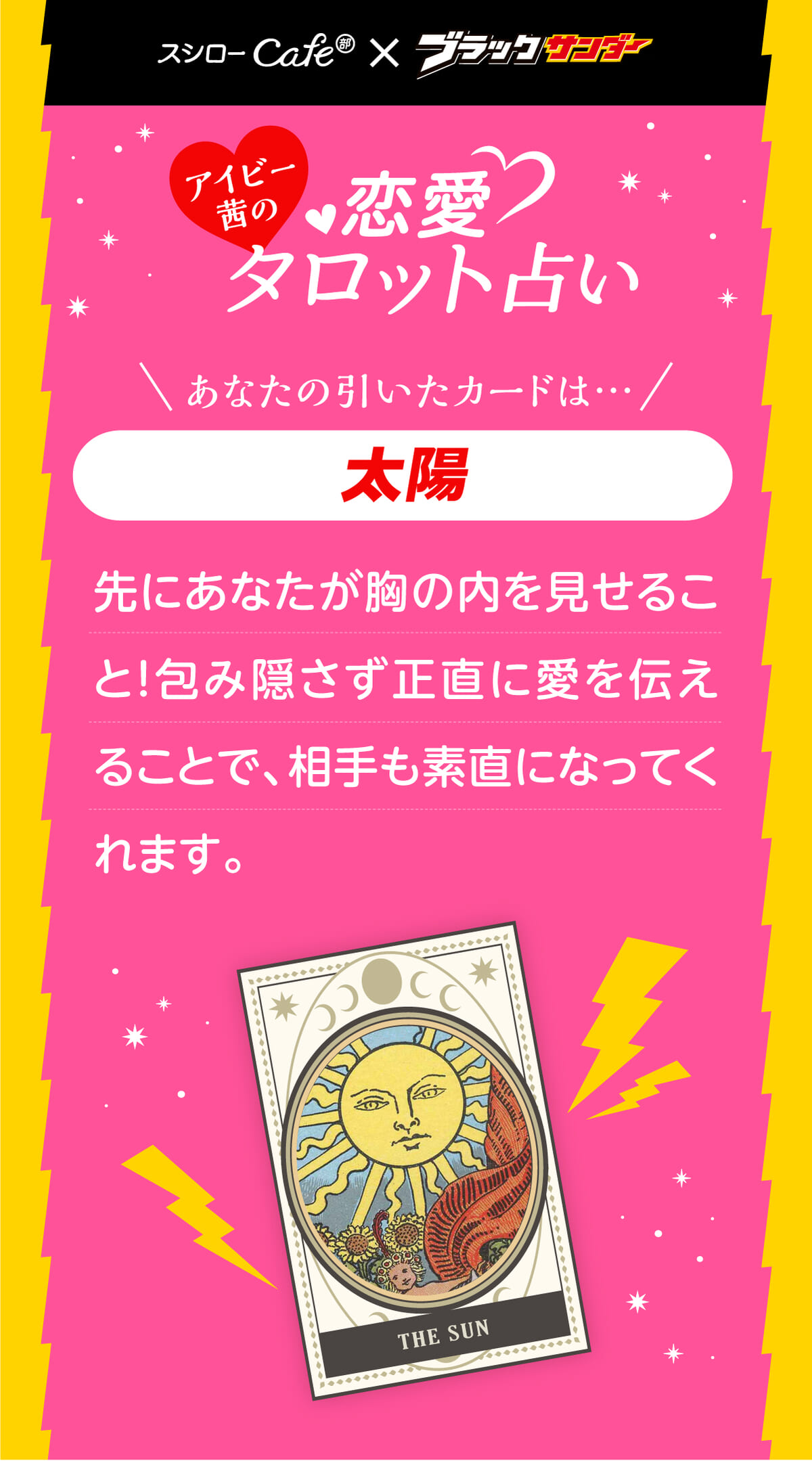 さらに「本命のザクふわブラックサンダーパフェ」には、二次元コードより有名占い師による恋愛タロット占いを引くことができるピックが付いています☆