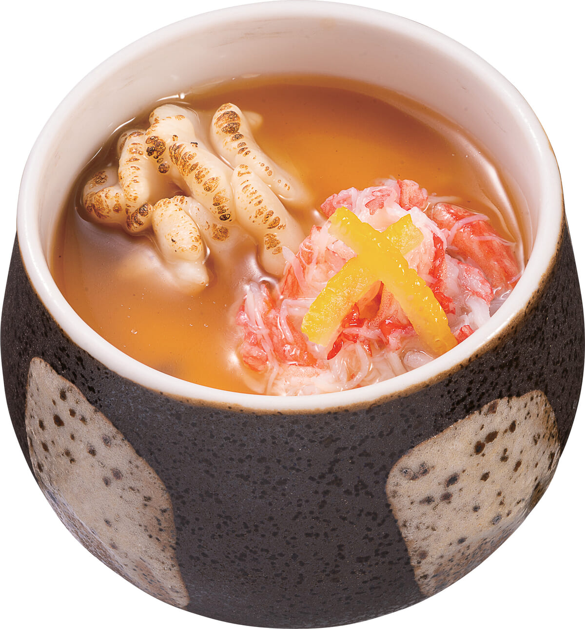 かつお出汁餡をかけ、白子とずわい蟹ほぐし身、柚子をトッピングした冬の味覚を味わう茶碗蒸し。