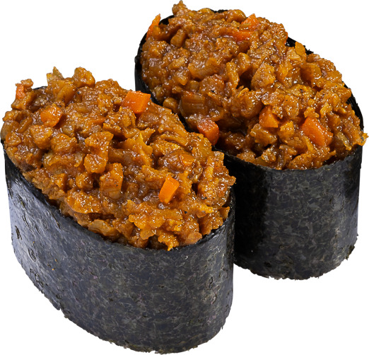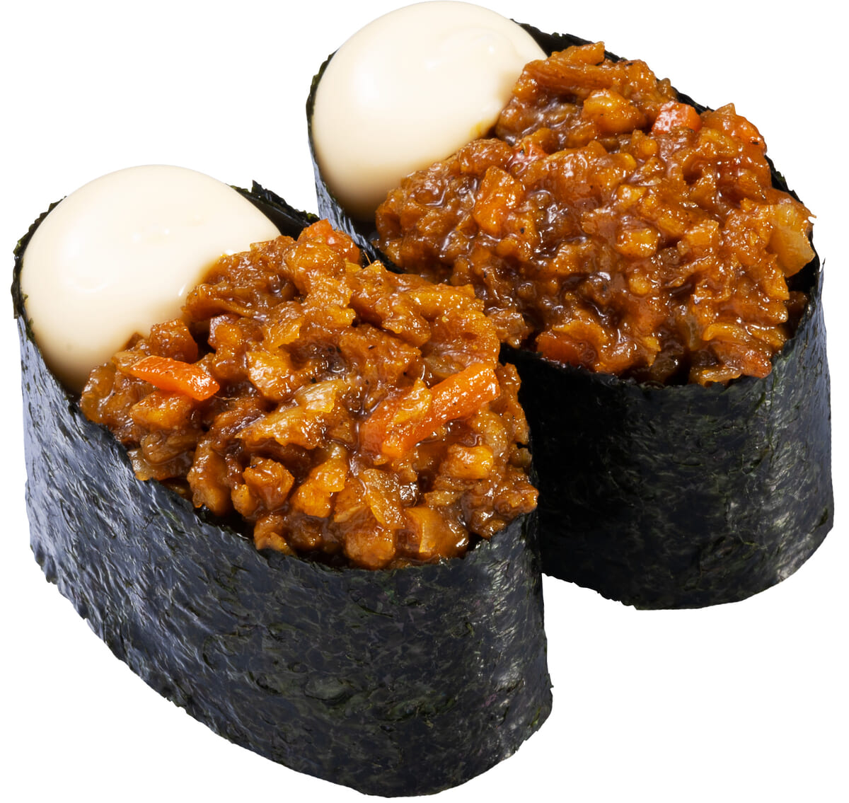 スパイスの香りが食欲をそそる大豆ミートのキーマカレーにマヨネーズを合わせた軍艦です。