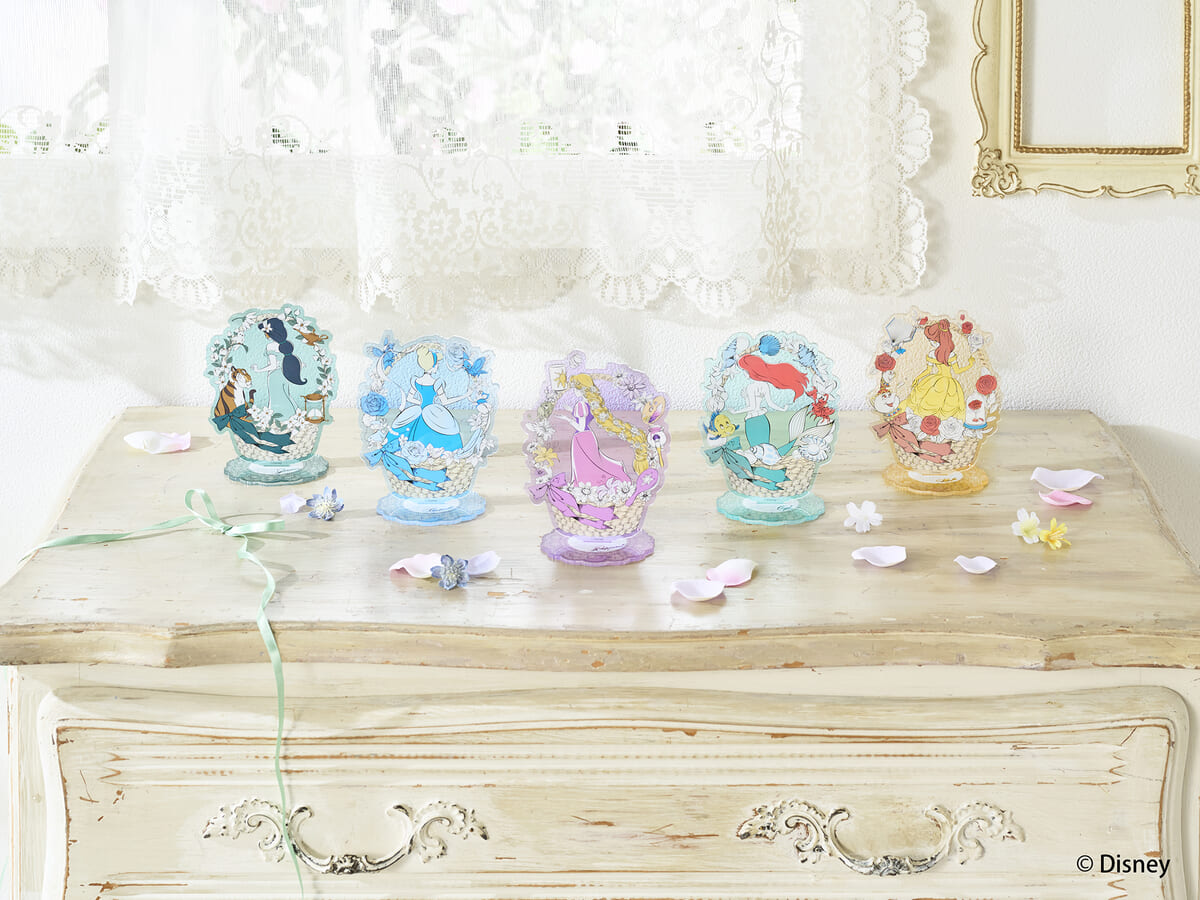 「シンデレラ」「ベル」「ジャスミン」「アリエル」「ラプンツェル」をデザインした、華やかなアクリルスタンド。