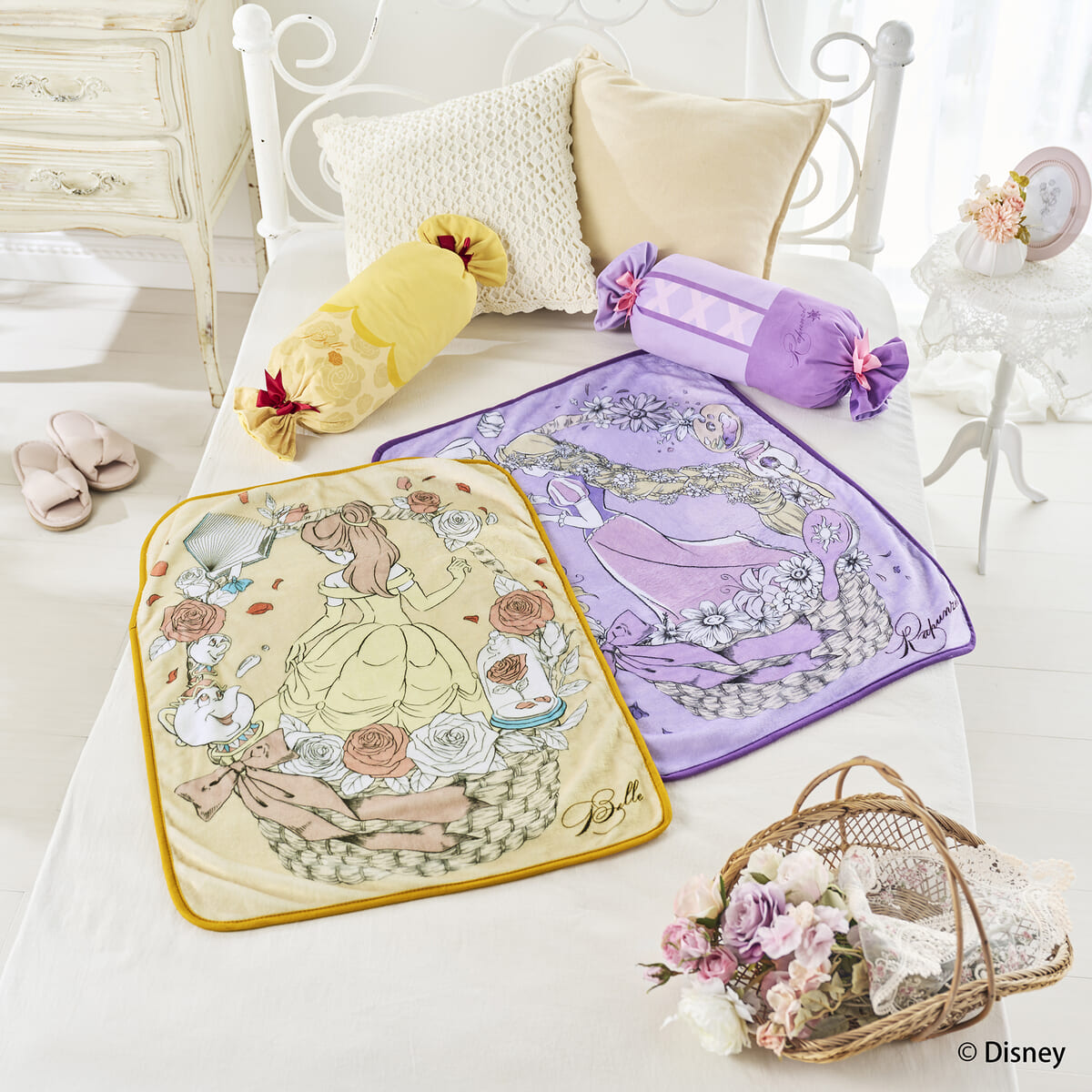 ブランケットにはディズニープリンセス「ベル」と「ラプンツェル」のうしろ姿とモチーフ、キャラクターをプリント。