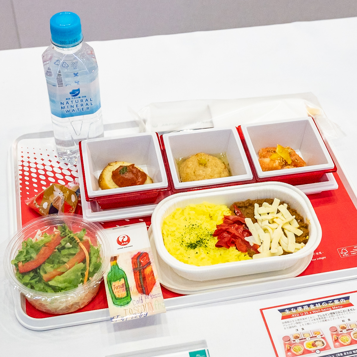 ファーストクラスでは機内食のほか、お好きなタイミング・お好きな組み合わせで楽しめるカレーやラーメンといったアラカルトメニューやドリンク類・アルコール類も充実しています。