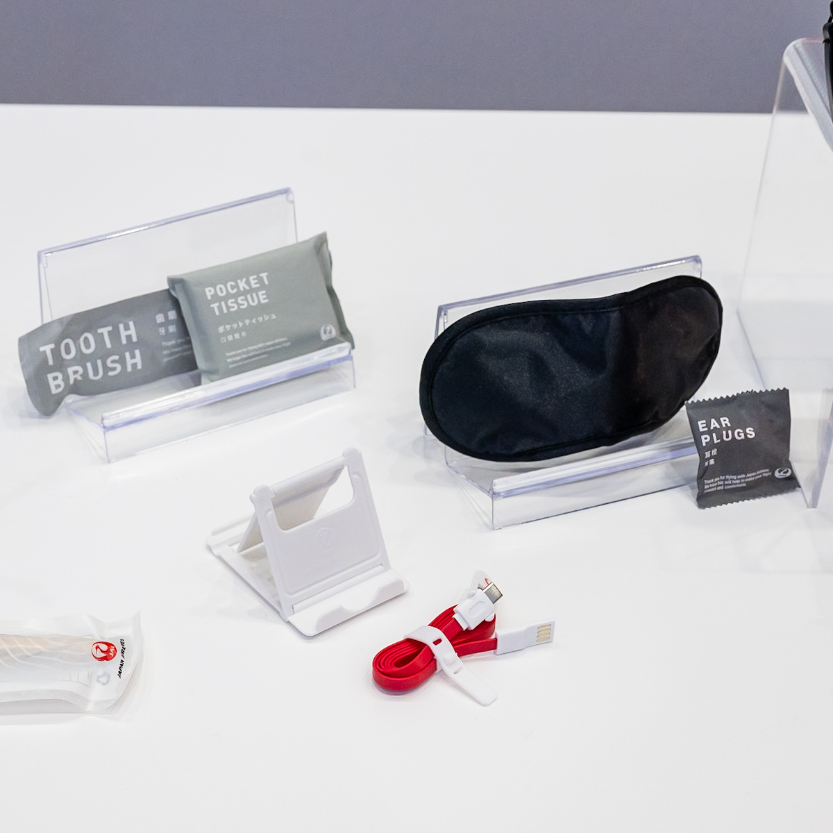 ビジネスクラスでは、歯磨きセット、耳栓、アイマスク、ポケットティッシュ、USB充電ケーブル(USB Type-C/Lightning)、スマートホンスタンドが提供されます。