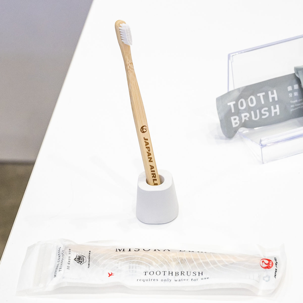 石油由来プラスチックを使わないJALオリジナル仕様の「水で磨く歯ブラシ”MISOKA”」をA350-1000就航記念として期間限定にて提供します。