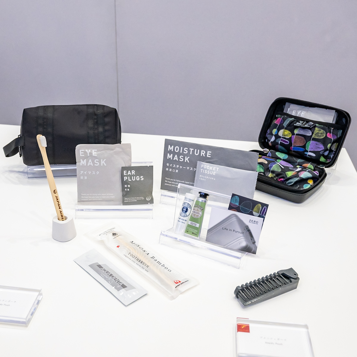 ファーストクラスではZERO HARRIBURTONとヘラルボニーがコラボレーションしたアメニティキットの内容品として提供(2024年6月末終了予定)、ビジネスクラスではA350-1000限定で提供されます(2024年2月末終了予定)。