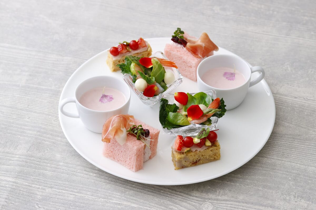 軽食(セイボリー)「春野菜と海老のサラダ/生ハムとラズベリークリームの スティックサンド/ビーツとジャガイモのヴィシソワーズ/いちごとトマトのタルティーヌ」