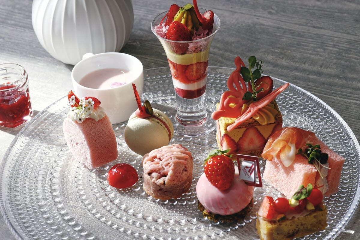 甘みと程よい酸味が絶妙ないちご「紅ほっぺ」と、”ナッツの女王”の異名を持つピスタチオを主役に迎え、それぞれの味わいを存分に堪能できるスイーツ・セイボリーがテーブルに並ぶ「Strawberry & Pistachio Afternoon Tea」