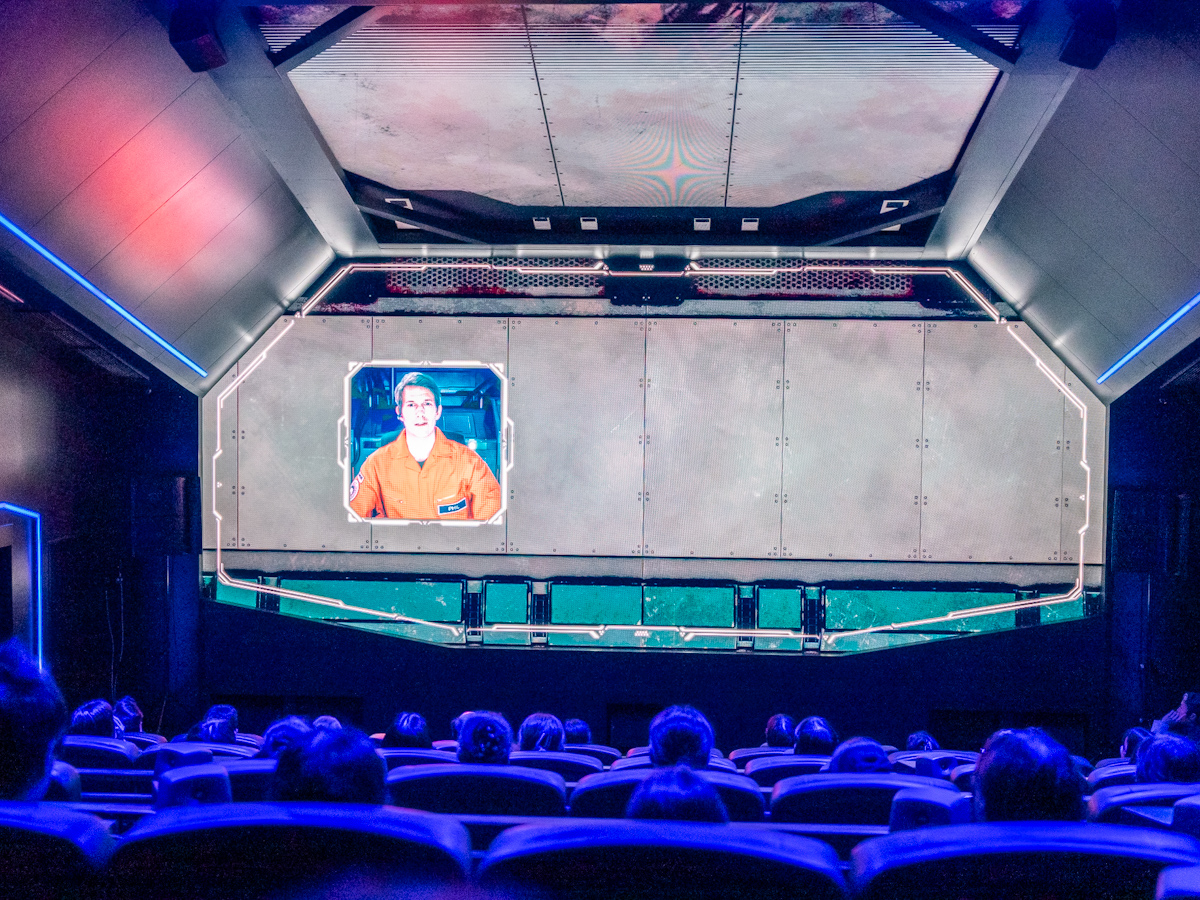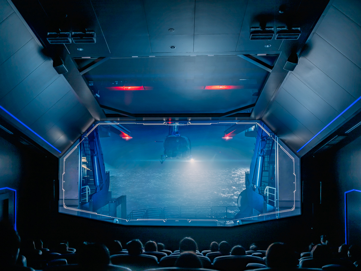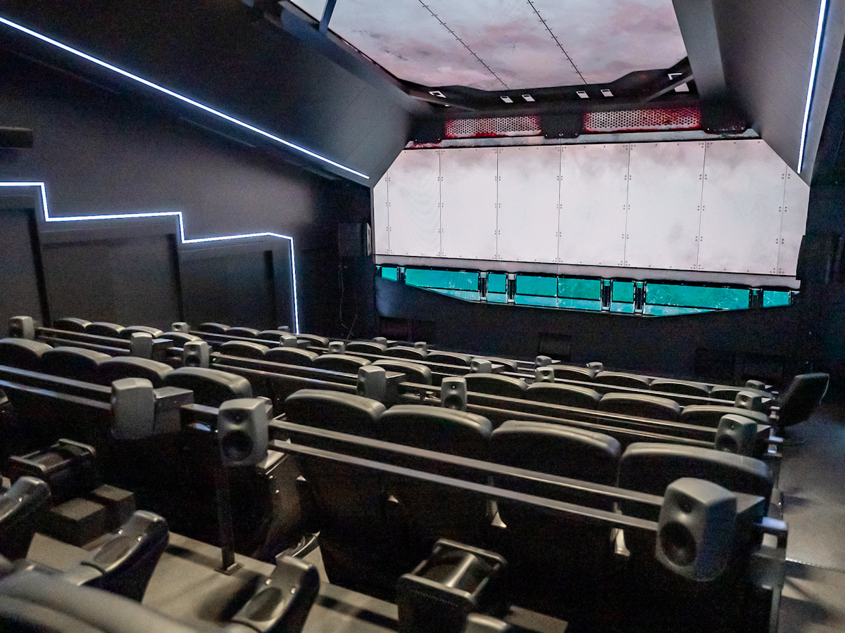 メインショーのエリアには一般的な映画館の2倍以上のコントラスト比を実現する高精細LEDスクリーンを前面(幅8m×縦3.5m)と天面(幅4.7m×縦4.3m)に設置。