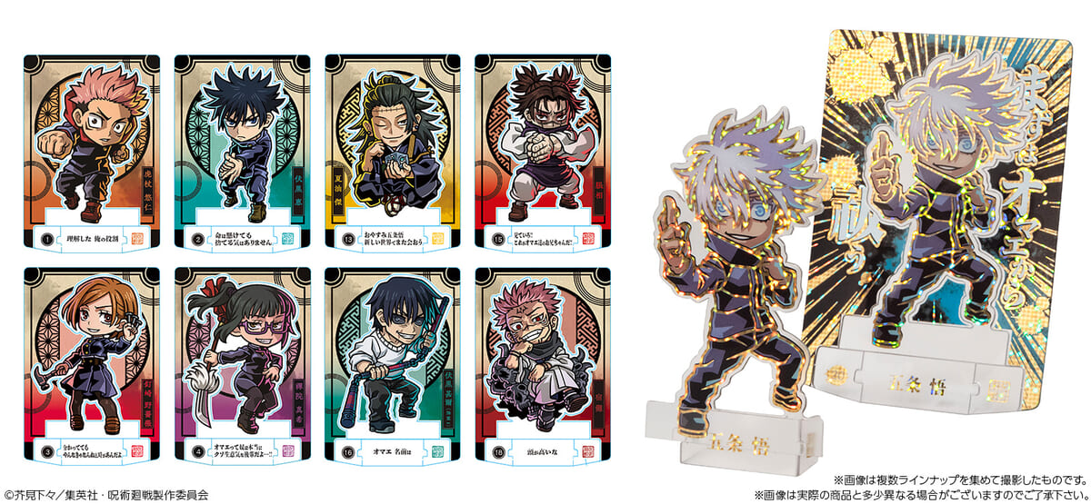カード(スタンドアート)のラインナップは「虎杖悠仁」をはじめ、「伏黒恵」「釘崎野薔薇」「五条悟」はもちろん、「夏油傑」「真人」など、「渋谷事変」の主要キャラクターを網羅した全22種。