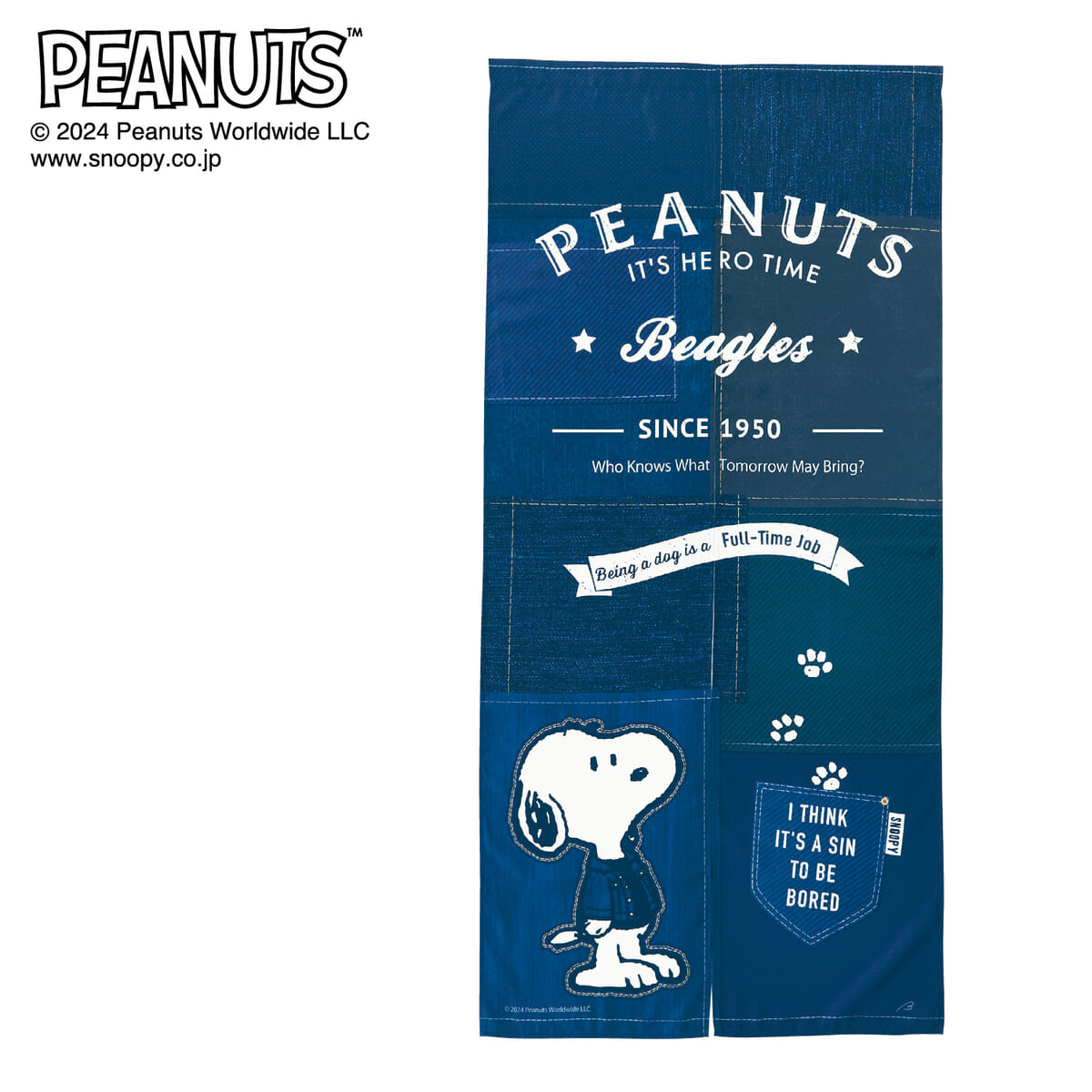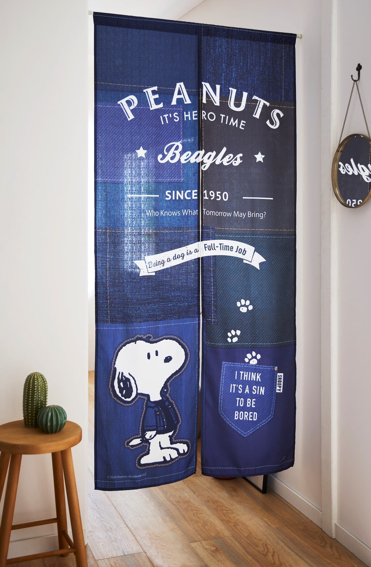 デニムを身にまとった「スヌーピー」がかわいい、デニム風プリントのれん。