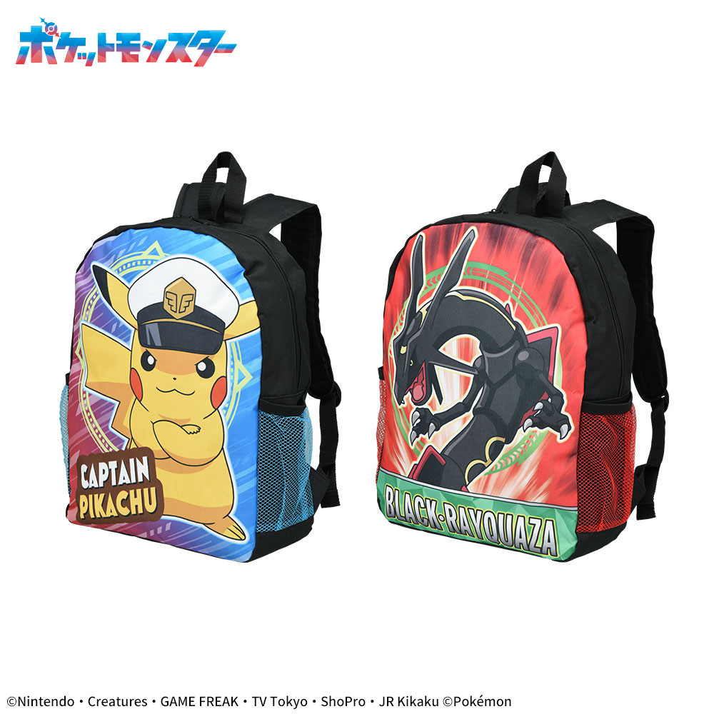 アニメに登場するポケモン、キャプテンピカチュウと黒いレックウザが大きくデザインされているリュック。