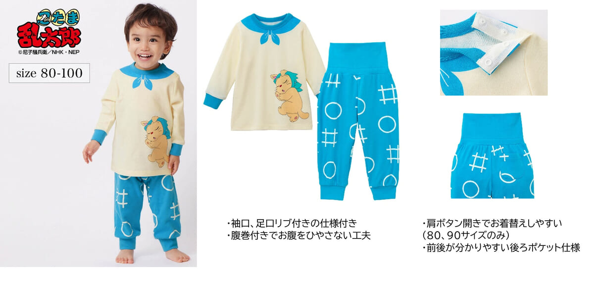 また、パジャマはシリーズ初の展開で、子ども用の「ヘムヘム柄のパジャマ」は「ヘムヘム」が寝ている姿がかわいいトップスに、ボトムにはブルーの一年生総柄を使用しています。