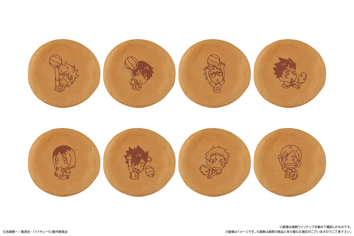 茶色でもちもちとした生地の今川焼きの表面に、躍動感のある『ハイキュー!!』のキャラクターたちのデフォルメデザインが施されています。