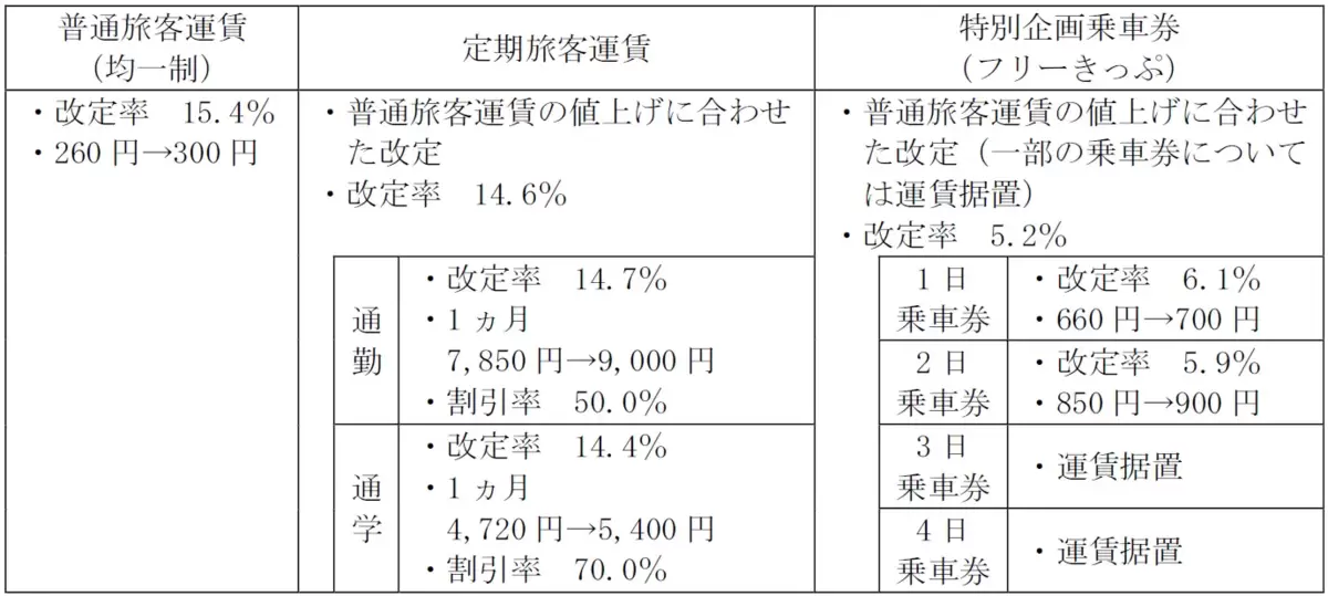 特別企画乗車券(フリーきっぷ)は各日の価格を改定。