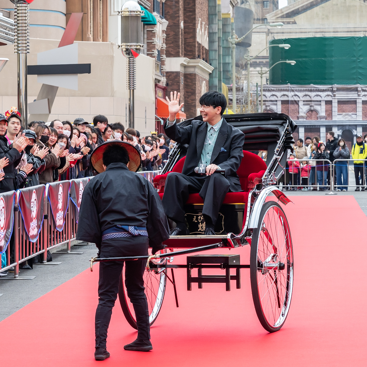 人力車に乗ってやってきたのは、竈門炭治郎役の声優・花江夏樹さん。