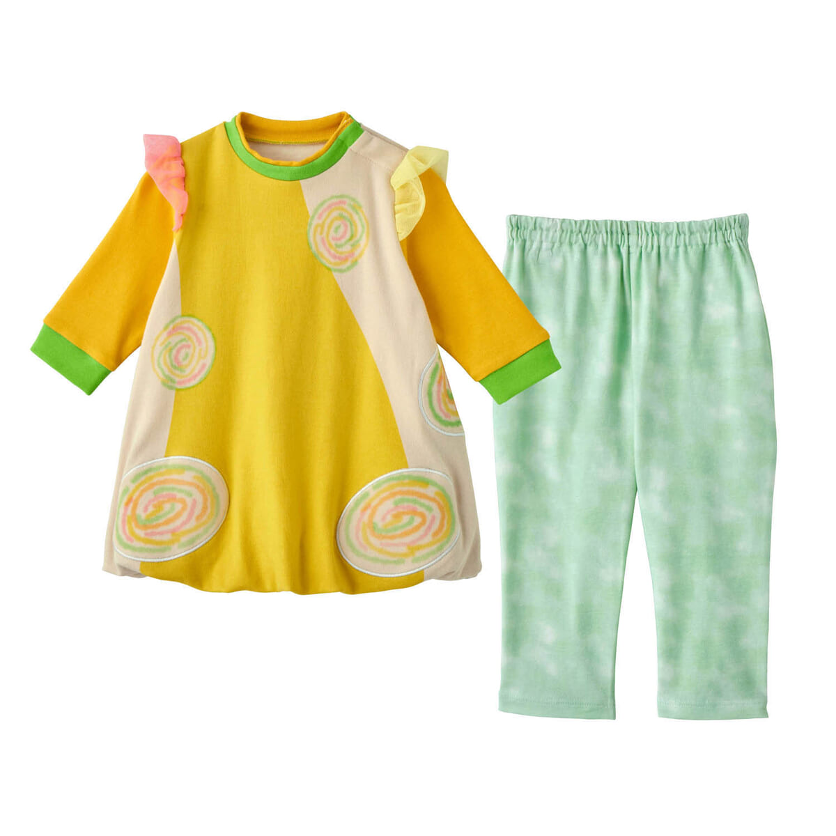 NHKの人気乳幼児向け番組「いないいないばあっ!」に登場する、お姉さんの「おうちゃん」の衣装をイメージした、上下セットのウェアです。