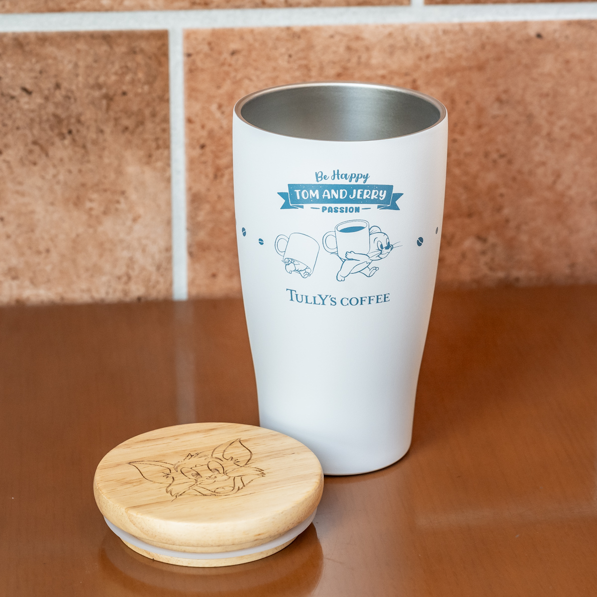 側面にはコーヒーを運ぶ「ジェリー」と「タフィー」、蓋にはにっこり笑顔の「トム」の顔をデザインしています。