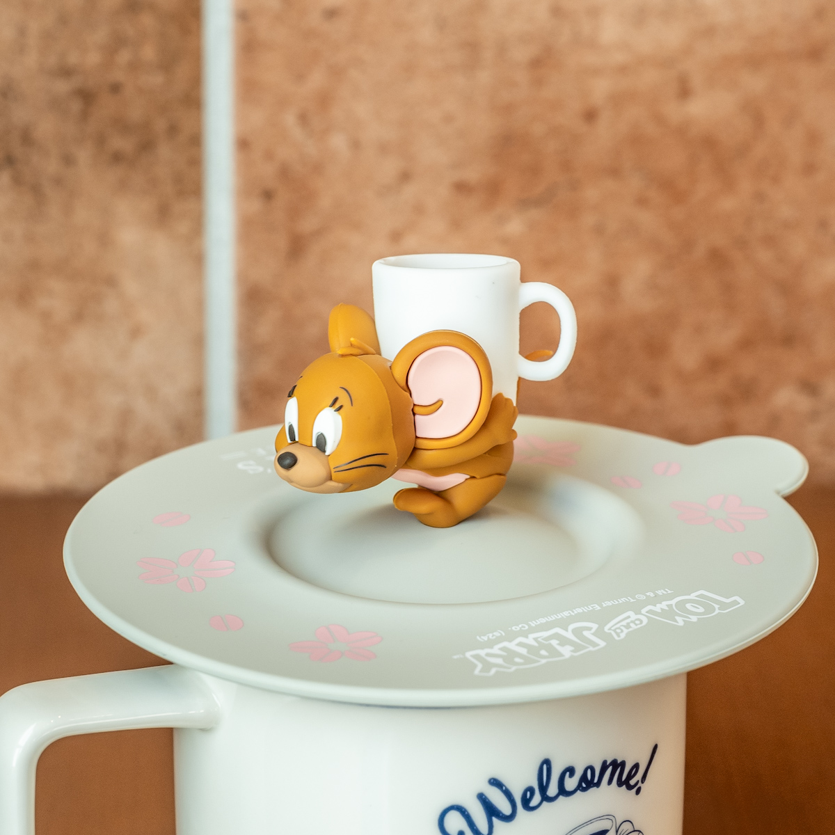 「ジェリー」がカフェラテを運んでいるフィギュアが付いた、マグキャップ。