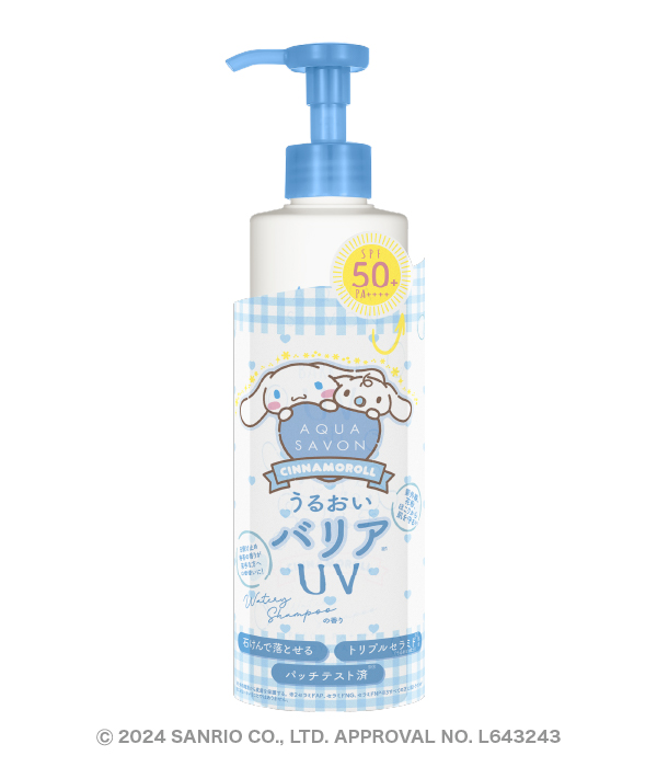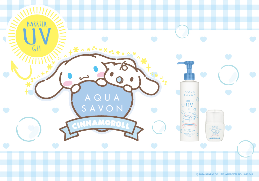 せっけんの香りをテーマにした、ウエニ貿易のコスメティックブランド「アクア シャボン」はの「バリアUVジェル ウォータリーシャンプーの香り」が「シナモロール」とコラボレーション。