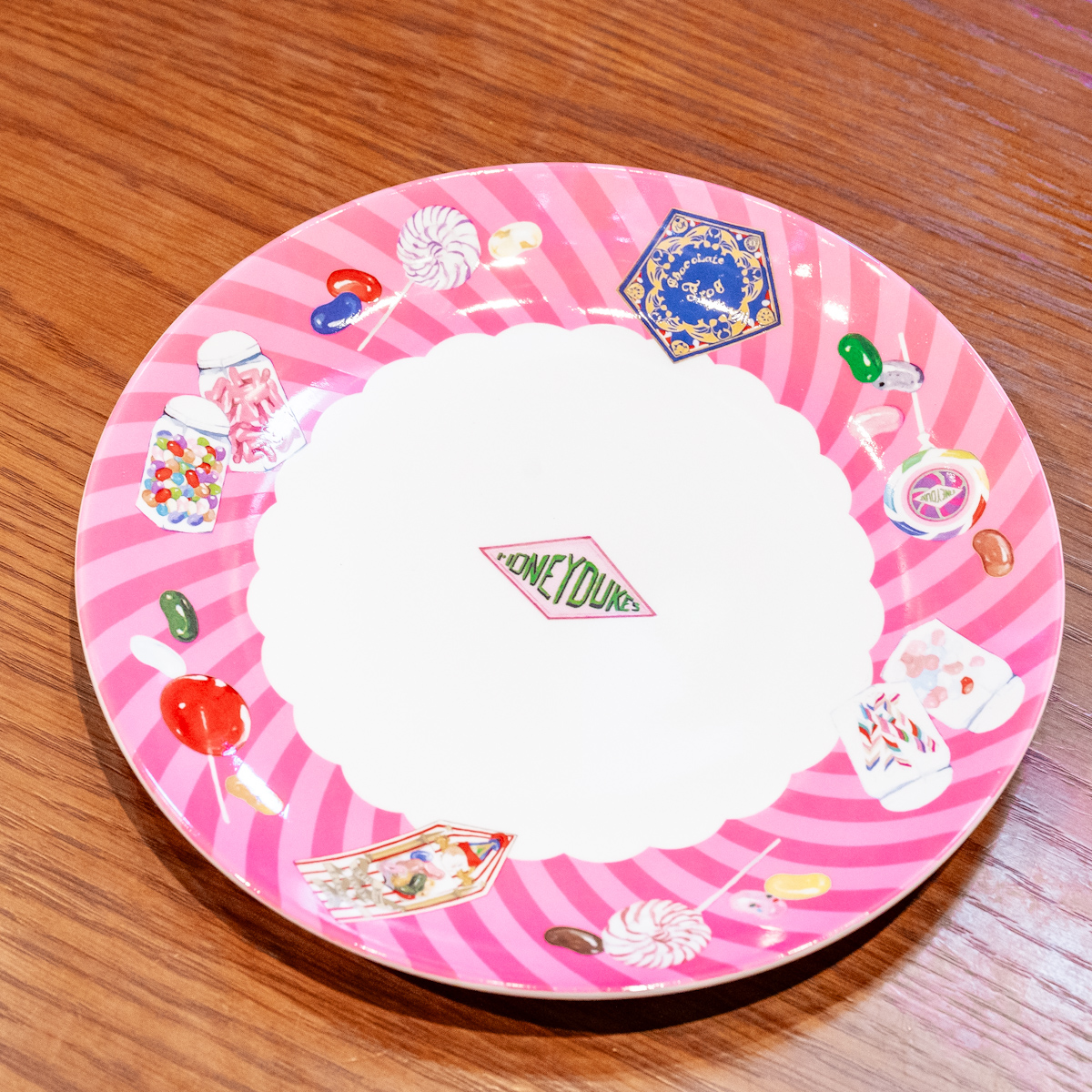 「ハニーデュークス」に並ぶ様々なお菓子を散りばめたデザインのプレート。