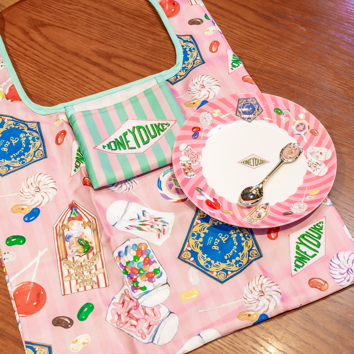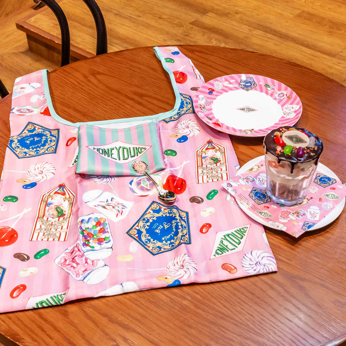 さらに、カフェオリジナルグッズとして「ハニーデュークス」に並ぶ様々なお菓子をイメージし、ピンクベースにチラシ柄をあしらった、プレート、スプーンやエコバッグなどが販売されます☆