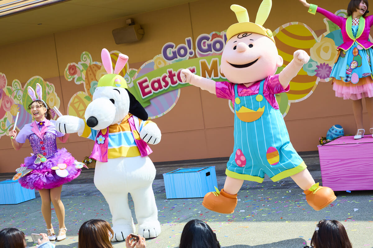 キュートでカラフルなイースターの装いに身を包んだ「セサミストリート」「ハローキティ」「ピーナッツ」「ミニオン」といったパークの仲間たちがストリートを超元気にマーチングしながら登場します。