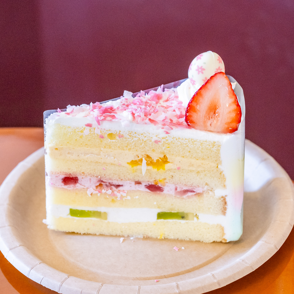 何層ものカラフルなフルーツとクリームがかわいいショートケーキ。