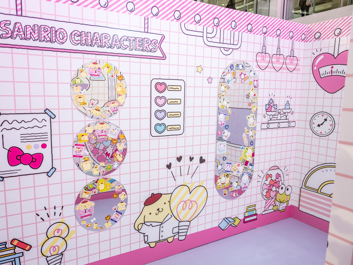 制服姿のサンリオキャラクターたちを描いたフォトスポットを回遊し自由に写真撮影を楽しめるスペース。