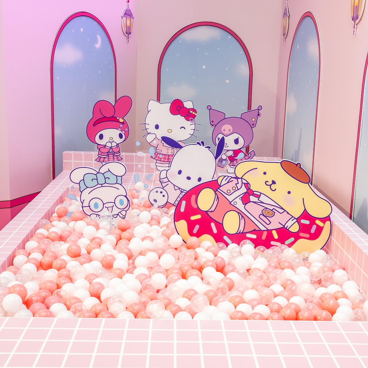 ピンクや白のボールで楽しそうにしているサンリオキャラクターたち。