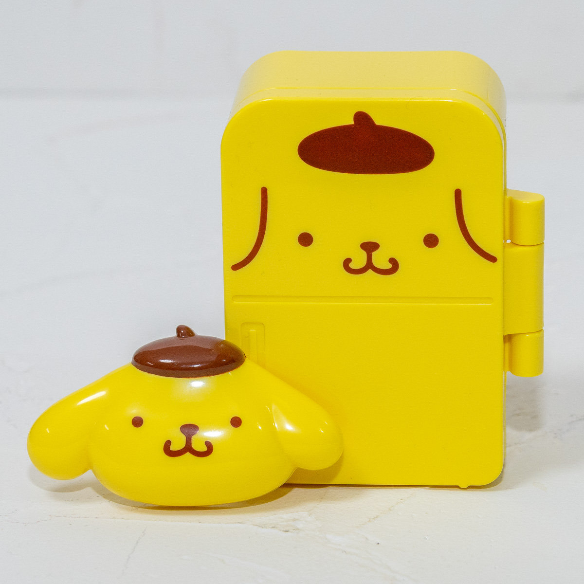 「ポムポムプリン」のお顔になったマグネットと、冷蔵庫の形をした小物入れのセット。