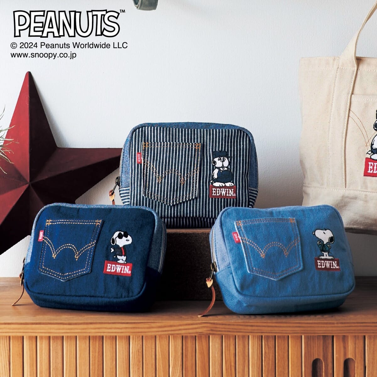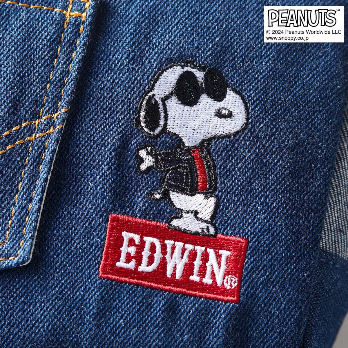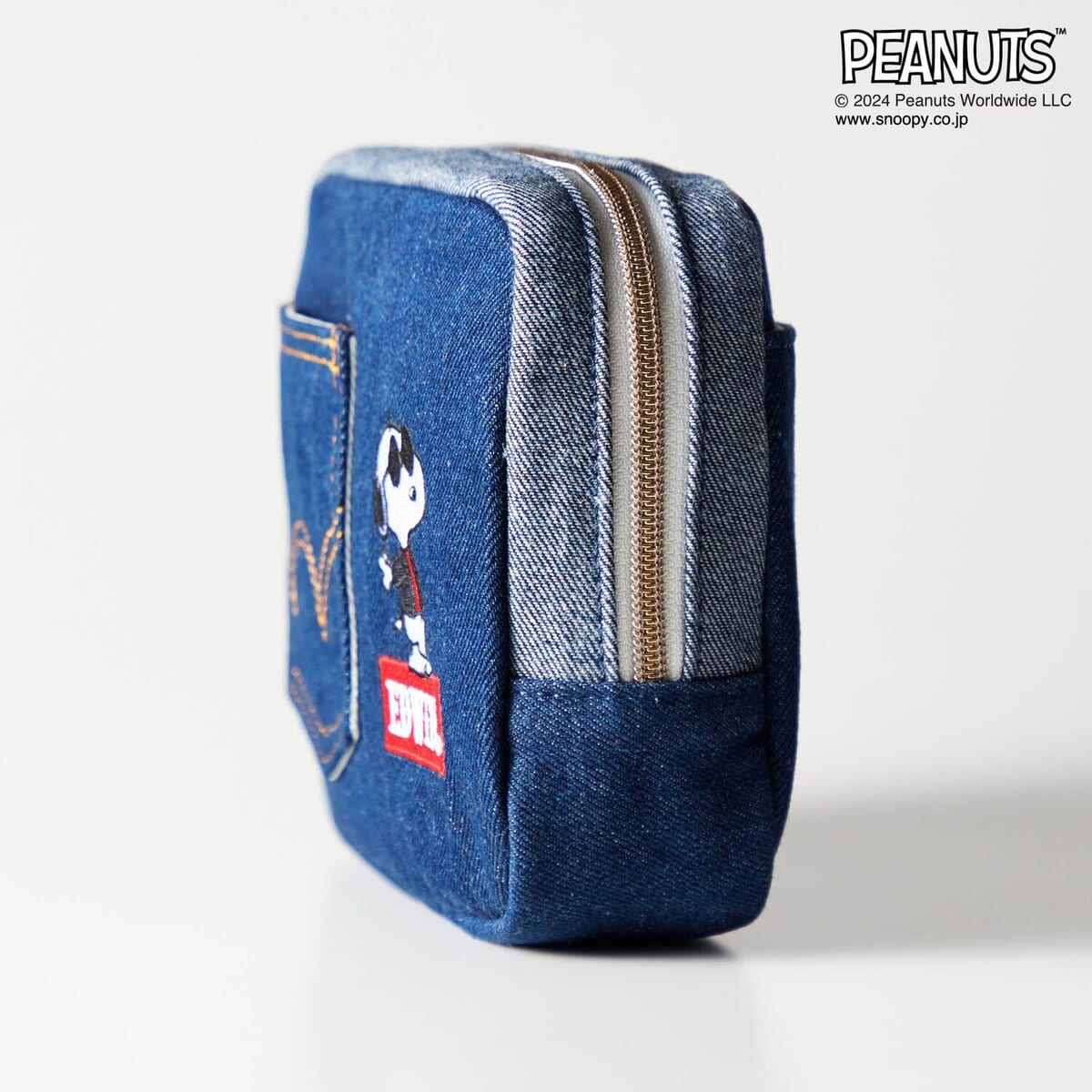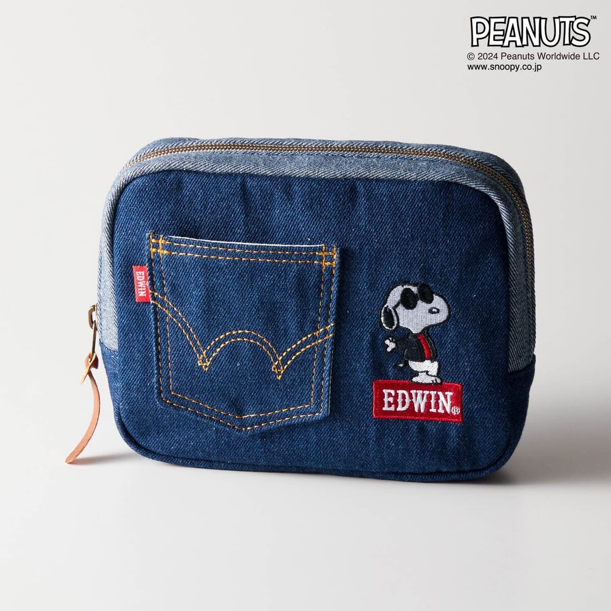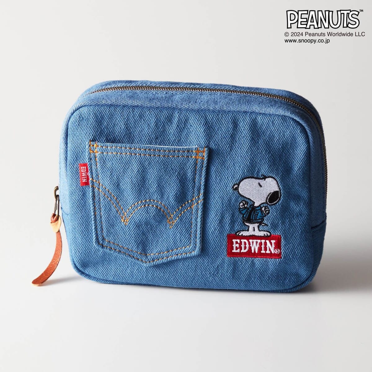 デニムのバックポケットをイメージしたポーチに、EDWINロゴと「スヌーピー」や「オラフ」の刺繍があしらわれています。
