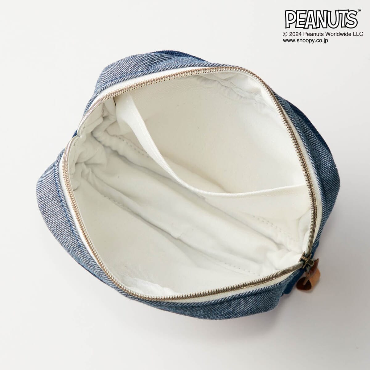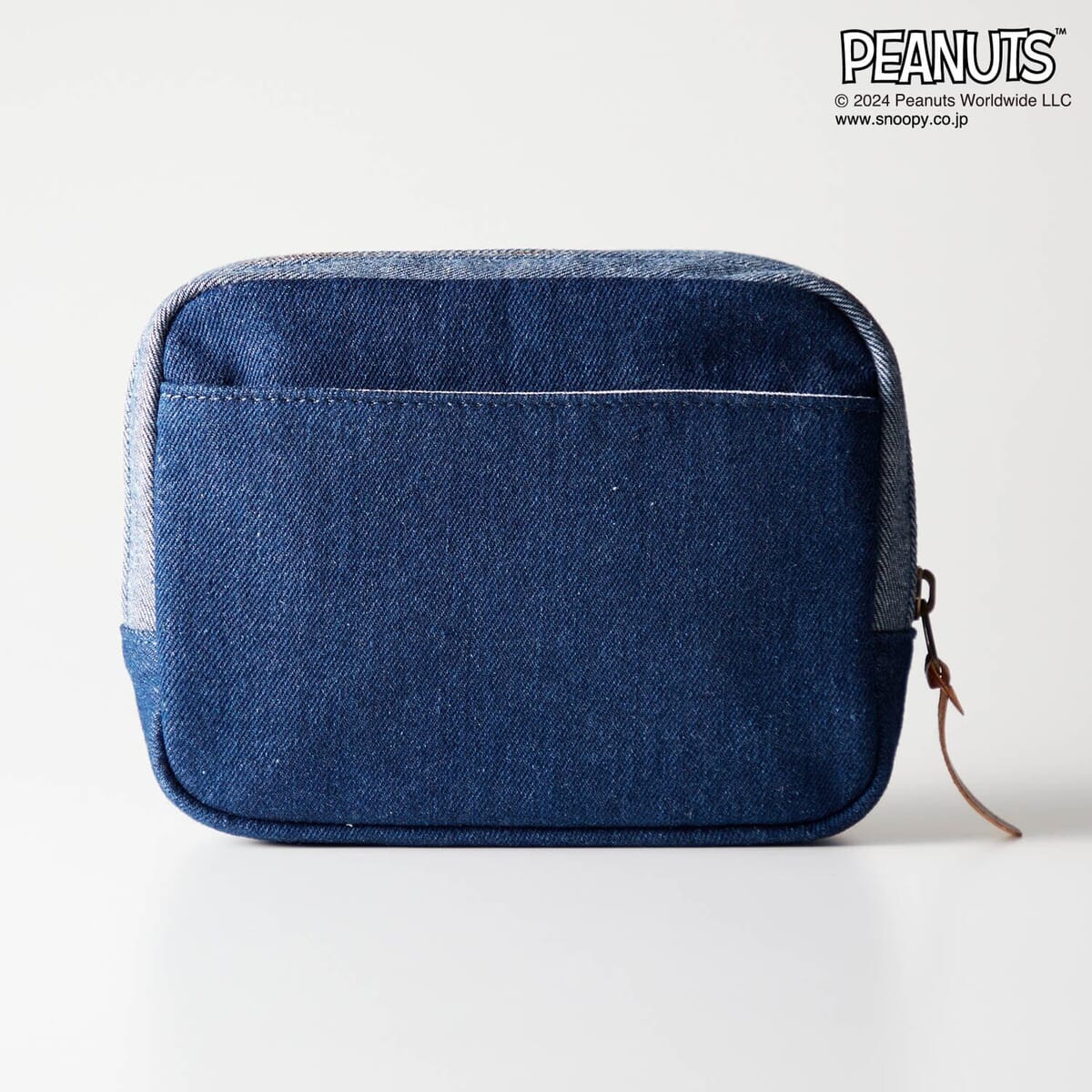 デニムジャケットでポーズを決める「スヌーピー」の刺繍がかわいいポーチ。