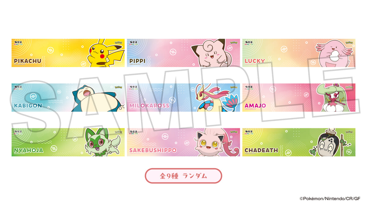 店舗入館時に、「入館料金+ポケモンかいふくのゆ プラスセット」を購入すると、9種類のポケモンのオリジナルマフラータオルがランダムでもらえます!