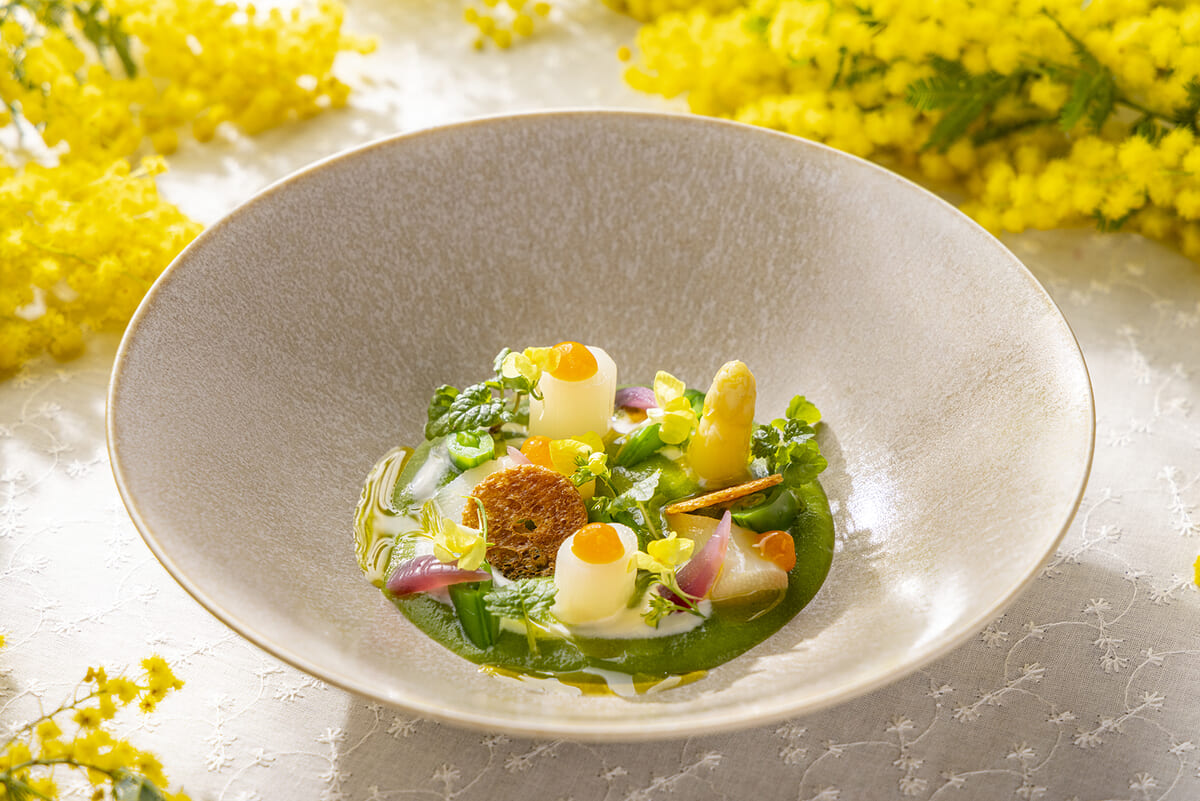 新鮮なホワイトアスパラと生ハムのブランマンジェの上に、旬の甘みたっぷりなスナップえんどうのソースを流し、ホワイトアスパラを始めとした春の食材を散りばめたメニューです。