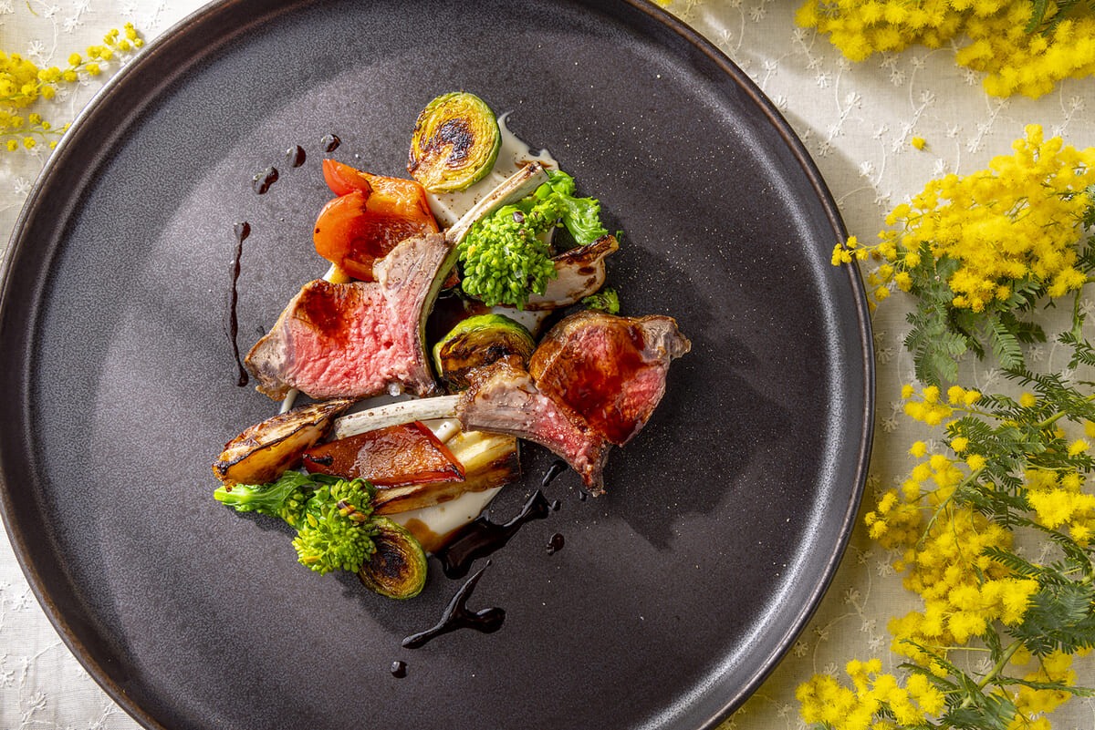 メイン料理は、福田シェフ考案の「ラムチョップのグリル ビーツリゾット 春野菜のソテー」は、食べ応えがありながら低糖質でヘルシーなラム肉を使用。