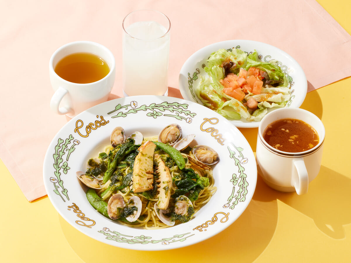 平日限定で提供されているココスのランチメニューに、春に旬を迎える食材を使用した「春野菜とあおさ海苔のボンゴレパスタランチ」や、ココス定番の包み焼きハンバーグがお得に楽しめる「濃厚ビーフシチューの包み焼きハンバーグランチ」などが登場します。