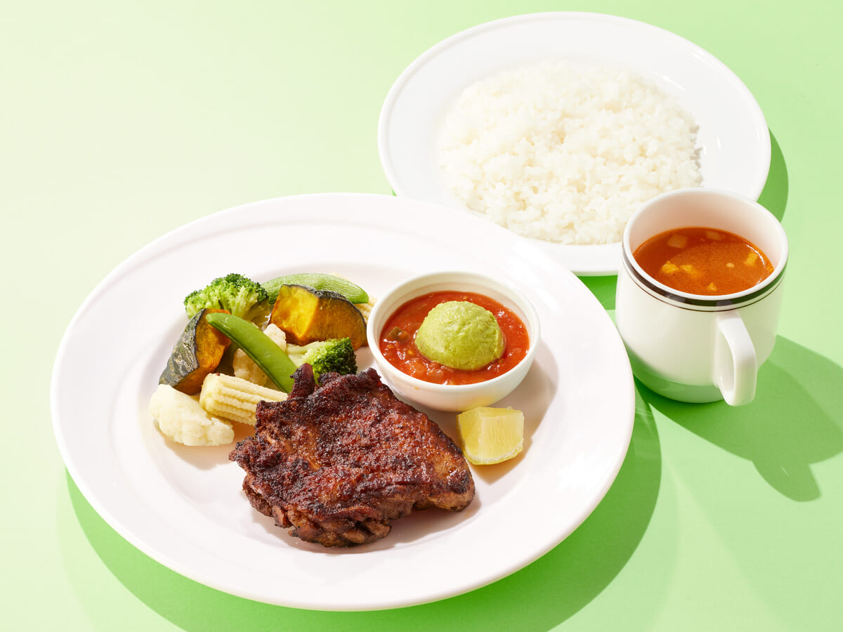 香りも味もスパイシーでジューシーなチキンステーキと、たっぷりの温野菜を、サルサソースやガッカモーレにディップしながらいただくのがおすすめです。