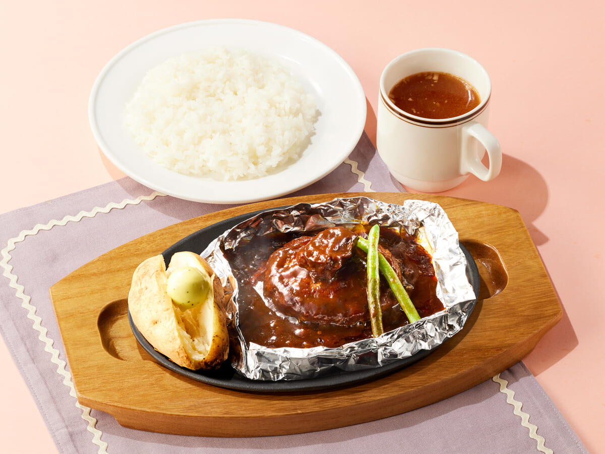 じっくり煮込んだ柔らかいビーフやマデラ酒がほんのり香るシチューソースと一緒に味わうハンバーグです。